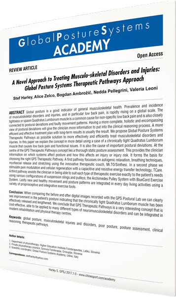 Global posture is a good indicator of general musculoskeletal health. Prevalence and incidence of musculoskeletal disorders and injuries, and in particular low back pain, is rapidly rising on a global scale. The tightness or spasm Quadratus Lumborum muscle is a common cause for non-specific low back pain and is also closely connected to postural deviations and faulty movement patterns. Having a more complete, holistic and encompassing view of postural deviations will give the clinician more information to put into the clinical reasoning process. A more efficient and effective treatment plan with long-term results is usually the result. We propose Global Posture Systems Therapeutic Pathways as possible solution to more effectively and efficiently treat musculoskeletal disorders and injuries. In this paper we explain the concept in more detail using a case of a chronically tight Quadratus Lumborum muscle that causes low back pain and functional issues. It is also the cause of important postural deviations. At the centre of the GPS Therapeutic Pathways concept lies a thorough static posture assessment. This provides the clinician information on which systems affect posture and how this affects an injury or injury risk. It forms the basis for choosing the right GPS Therapeutic Pathway. A first pathway focusses on autogenic relaxation, breathing techniques, myofascial release and stretching using the innovative therapeutic table, Mi.To./Sinthesi. In a second phase we stimulate pain modulation and cellular regeneration with a capacitive and resistive energy transfer technology, TCare. A third pathway assists the clinician in being able to suit each type of therapeutic exercise exactly to the patient’s needs using various configurations of suspension slings and pulleys; the Archimedes Pulley System with BlueCord Exercise System. Lastly new and healthy movement and posture patterns are integrated in every day living activities using a variety of proprioceptive and integrative exercise tools.